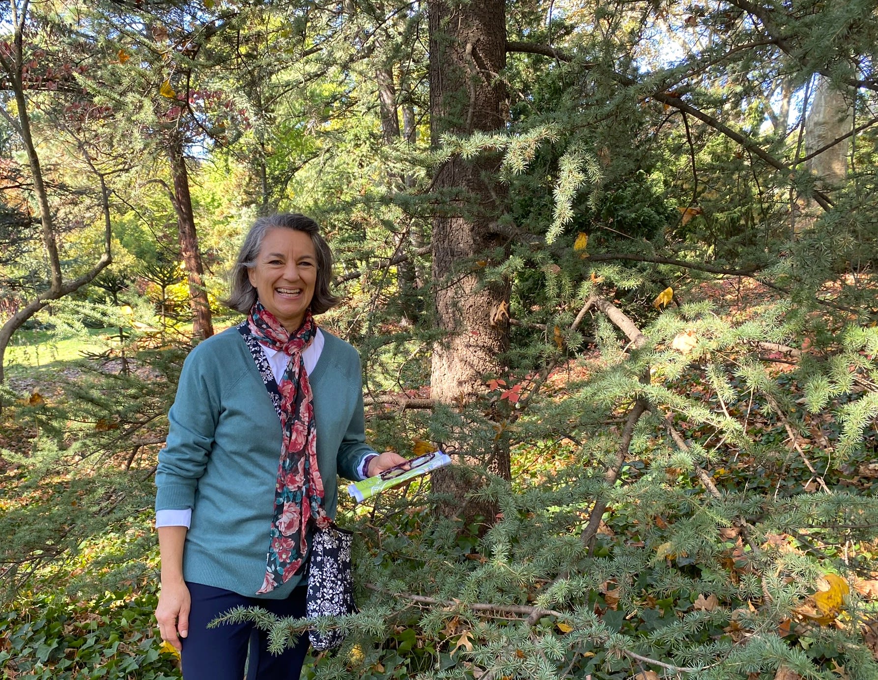 With the help of my GardenComm colleague Erica Grivas and her adorable investigative urgency, we consulted with horticultural staff to track down these splendors, trudging through ivy ground cover to confirm Cedrus libani. The specimen I’m standing with is not original to the garden’s beginnings, but planted more recently, a mere “sapling” of forty years or so, considering cedar of Lebanon trees can live for a millennium. What a treasure hunt!