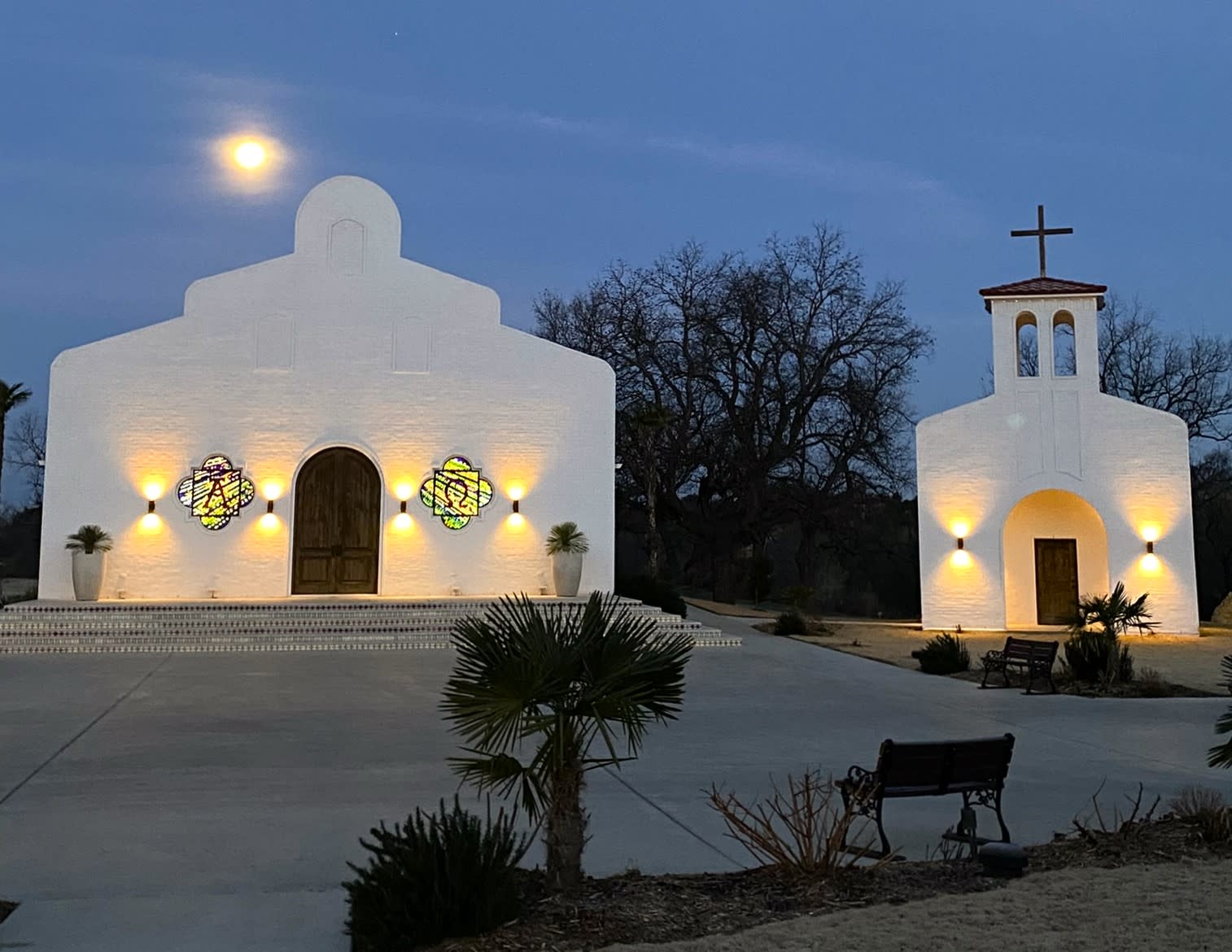 This sunrise view of the Casa Del Rey chapel captures the full moon still in the sky, enhancing the tranquility of this amazing place. The whitewashed façade of the building hardly reveals the breathtaking colors awaiting indoors. Hand-crafted with imagery from Revelation 4, the sanctuary space is adorned with stunningly rugged stained-glass windows and crown-topped carved pine pews. Our spontaneous worship songs easily filled the hall with happy sound.