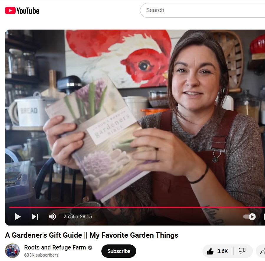 discover the wonderful, faithful homesteader Jessica Sowards of Roots & Refuge Farm AND enjoy her recommendation of my first book, God’s Word for Gardener’s Bible in her “A Gardener’s Gift Guide” – promoted at the 25:33 minute mark